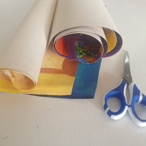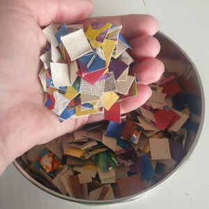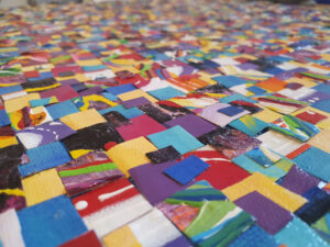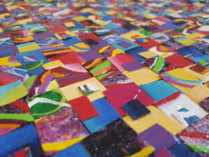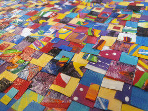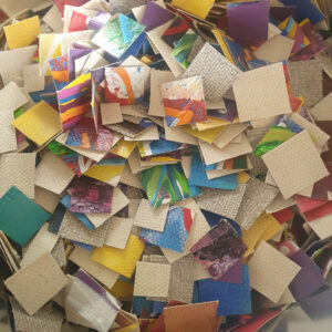 Alors plutôt que laisser trainer ces textures et couleurs, pourquoi ne pas les réutiliser. Découpés en petits carrés, ces bouts de toiles offrent un nouveau moyen d’expression !