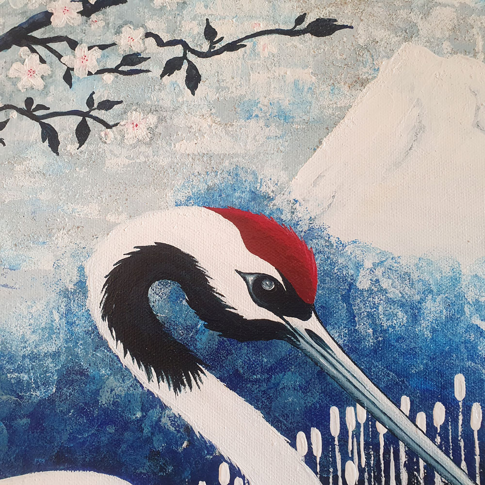 « Grue Japonaise » – 50x50cmPar maud / 20 juin 2024 50x50cmPeinture acrylique, une touche de sable.Toile sur châssis.🟢 Disponible