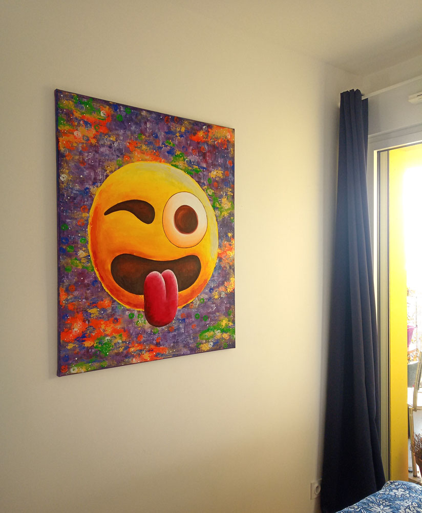 « Happiness » – 81x100cmPar maud / 3 novembre 2023 81x100cmPeinture acrylique, sable.Toile sur châssis.🟢 Disponible Un smiley grand format qui donne la pêche dès le matin.